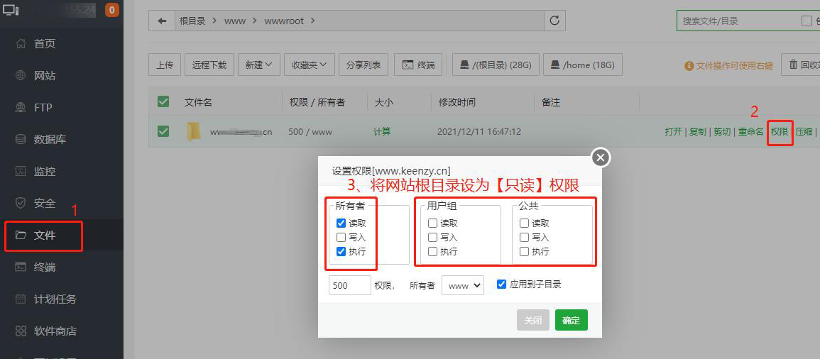 依次登錄【寶塔面板后臺】-【文件】,找到您需要配置的網(wǎng)站,點(diǎn)擊右側(cè)的【權(quán)限】,按下圖進(jìn)行設(shè)置
