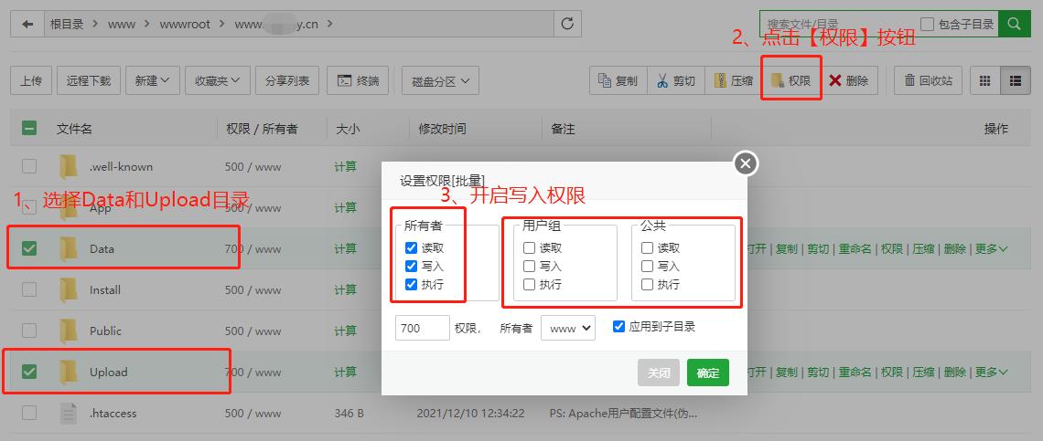 2、將Data和Upload目錄設(shè)置為可讀寫權(quán)限,按下圖設(shè)置即可
