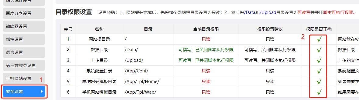 4、登錄網(wǎng)站管理后臺,依次進(jìn)入【設(shè)置】-【安全設(shè)置】,檢查一下目錄權(quán)限是否設(shè)置正確