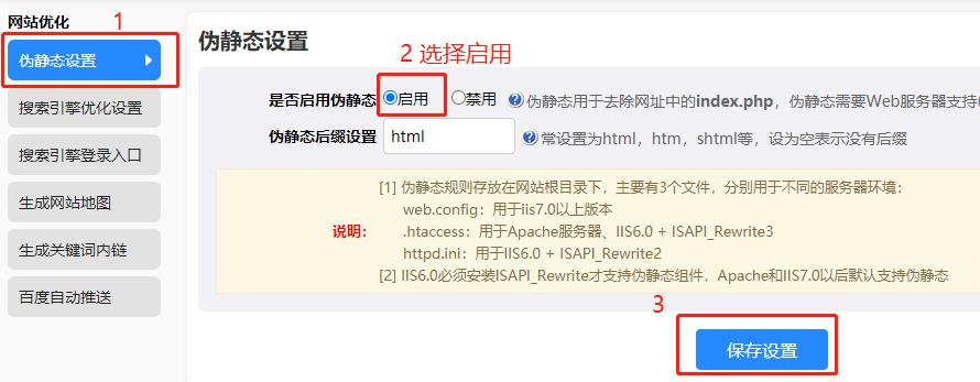 3、在寶塔面板啟用偽靜態(tài)后,然后登錄網(wǎng)站管理后臺,依次進(jìn)入【優(yōu)化】-【偽靜態(tài)設(shè)置】,啟用偽靜態(tài)即可,如下圖所示: