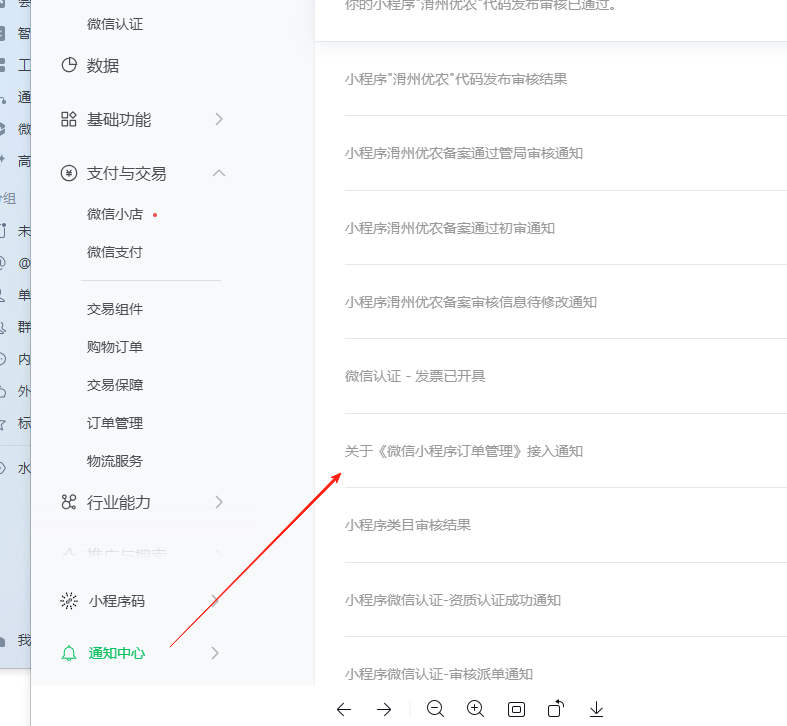 并在在小程序后臺收到了消息:《微信小程序訂單管理》接入通知。如下圖所示