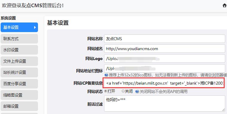 1、登錄網站后臺,在系統設置——》基本設置里——》找到“網站ICP備案信息”,如下圖