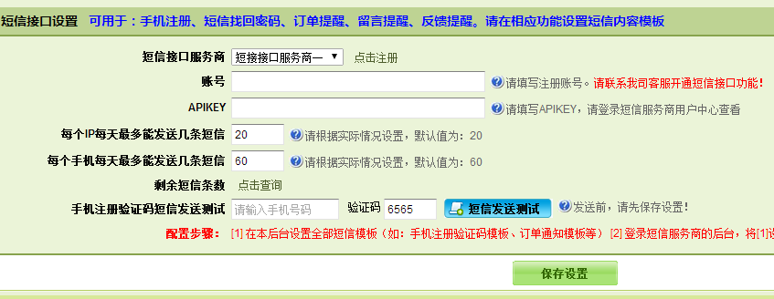 在后臺(tái)設(shè)置好短信接口,即可以擁有手機(jī)短信注冊(cè)、訂單短信通知、留言短信通知、手機(jī)短信找回密碼、反饋短信通知等