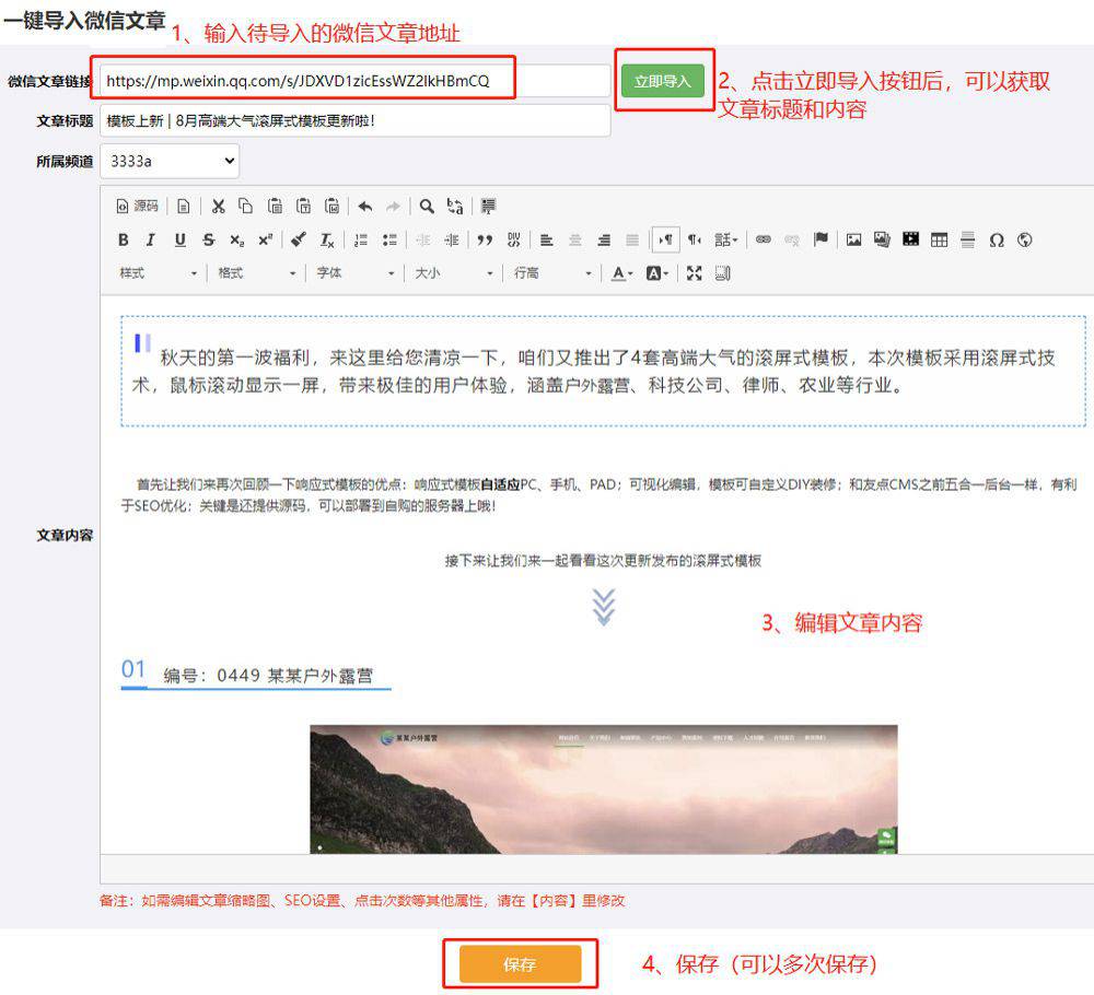 1)點擊按鈕導(dǎo)入后,首次點擊【保存】為添加一篇新的文章,再次點擊【保存】為更新當(dāng)前文章